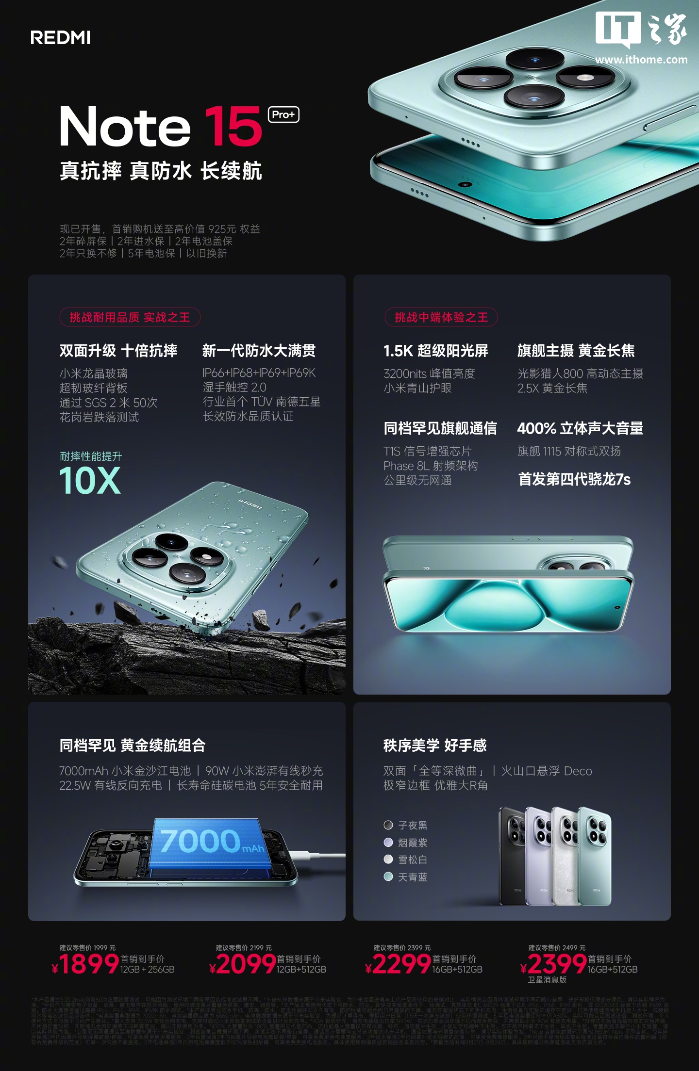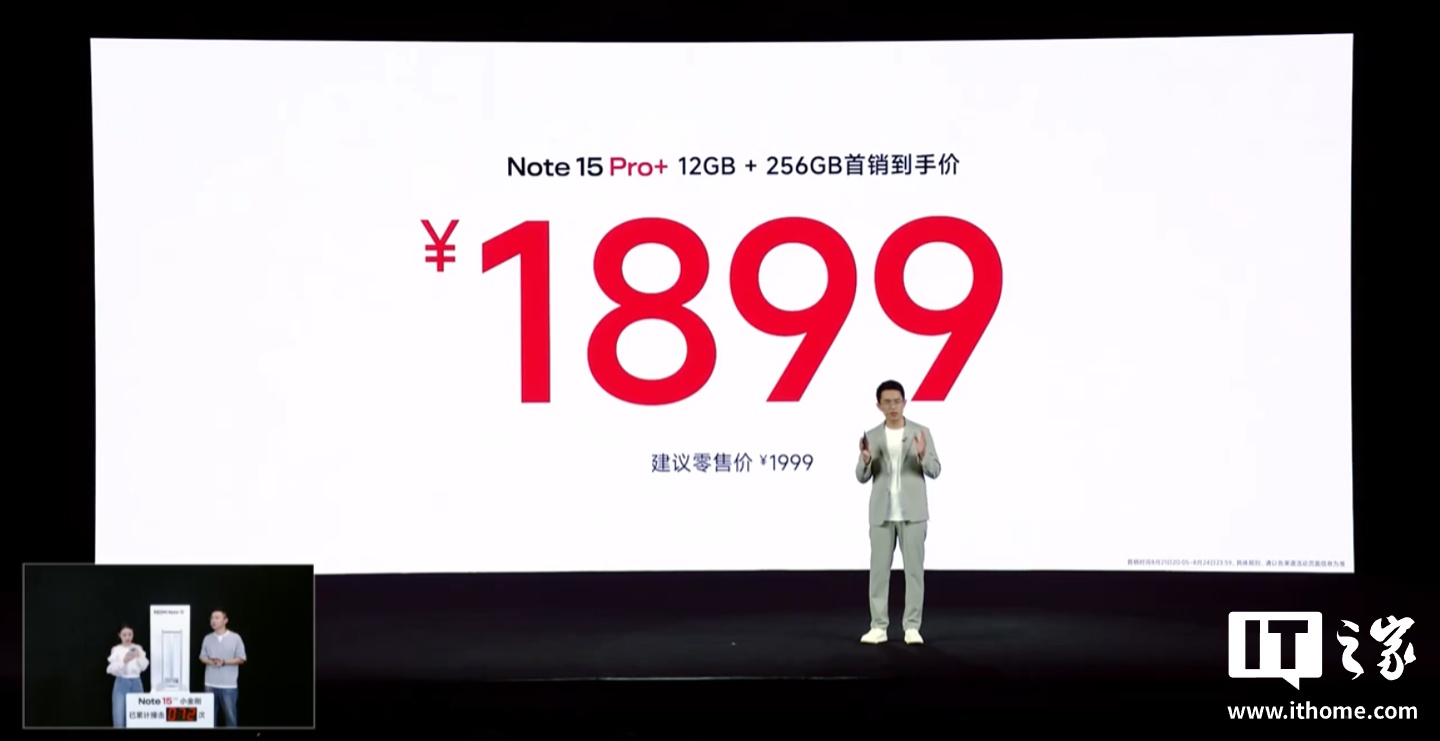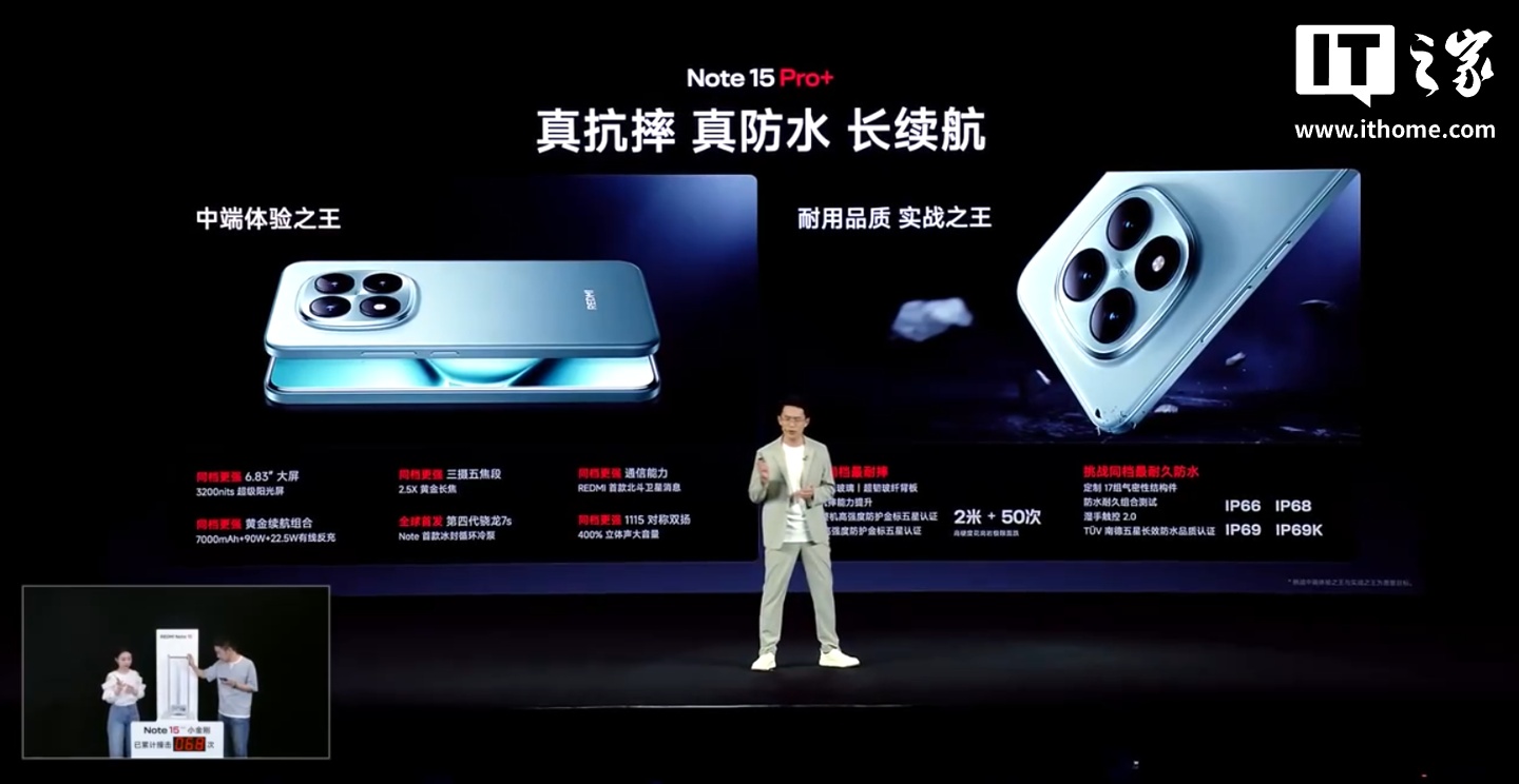 IT之家 8 月 21 日消息,小米 REDMI Note 15 Pro+ 手机今晚正式发布,新机首发第四代骁龙 7s 处理器,主打“真抗摔、真防水、长续航”特性,售价 1999 元起、首发 1899 元起(12GB+256GB 版本)