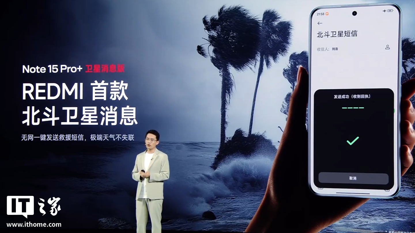另外,小米还推出了 REDMI 首款北斗卫星消息版手机 —— 小米 REDMI Note 15 Pro+ 卫星消息版,支持无网一键发送救援短信,小米中国区市场部总经理、REDMI 品牌总经理王腾表示,卫星通信功能并非无用,可以在极端天气下不失联。新机还配备 1115 大尺寸对称双扬,支持 400% 大音量(小米首款立体声大音量)。