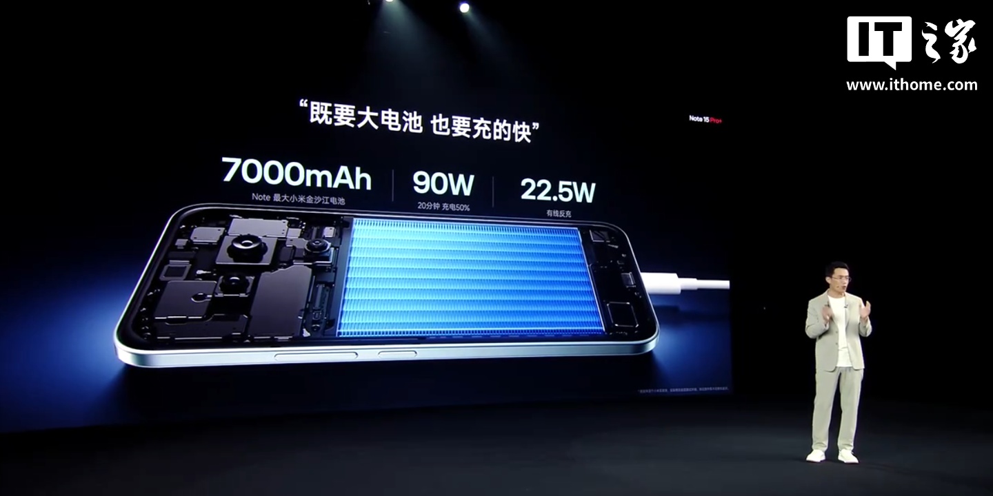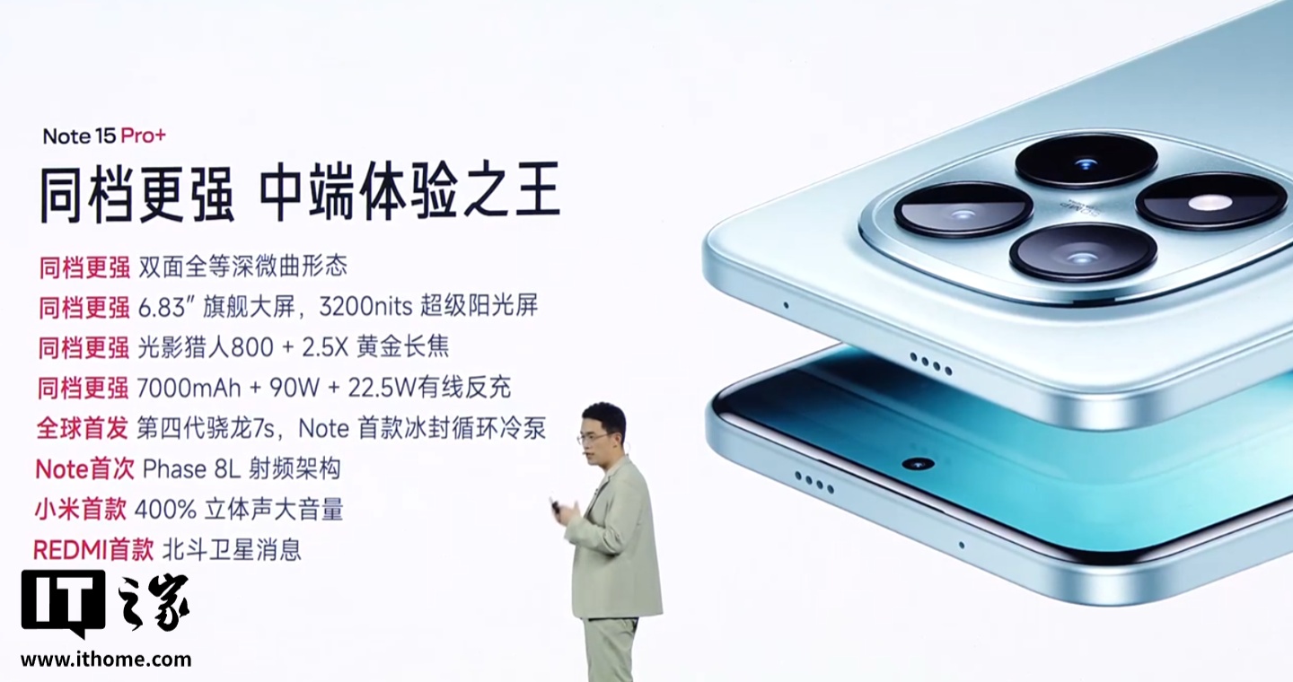 IT之家从小米 REDMI 官方获悉,REDMI Note 15 Pro+ 手机首发第四代骁龙 7s 处理器,Note 首次搭载冰封循环冷泵;内置 7000mAh Note 系列最大小米金沙江电池,支持 90W 有线快充 + 22.5W 反向有线充电,宣称“不管怎么用,都能扛一天”。