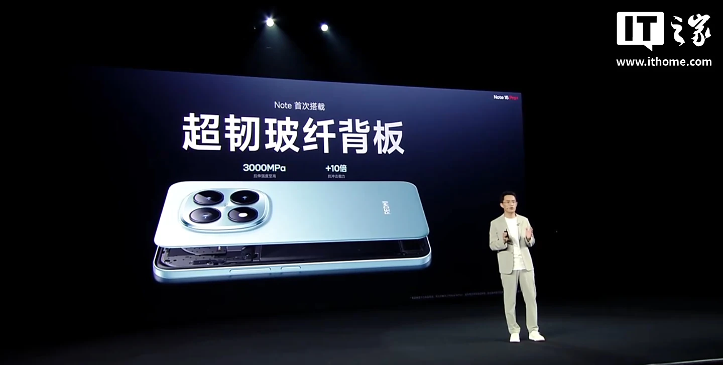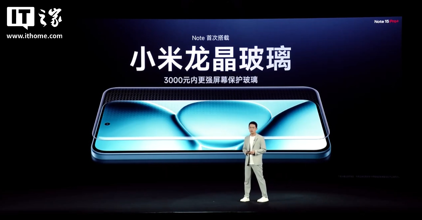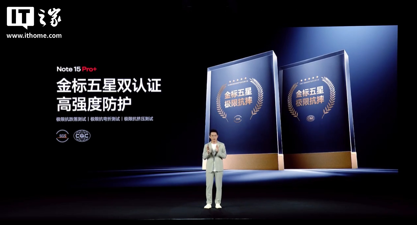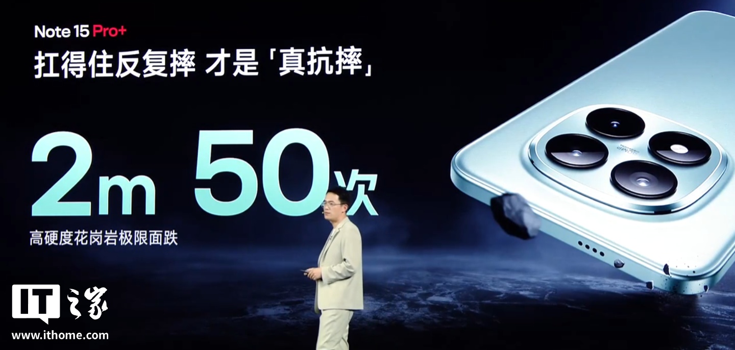 小米 REDMI Note 15 Pro+ 手机“Note 首次”搭载小米龙晶玻璃 + 超韧玻纤背板,提升保护能力,通过了 2 米 50 次的高硬度花岗岩极限面跌,拥有金标五星双认证。