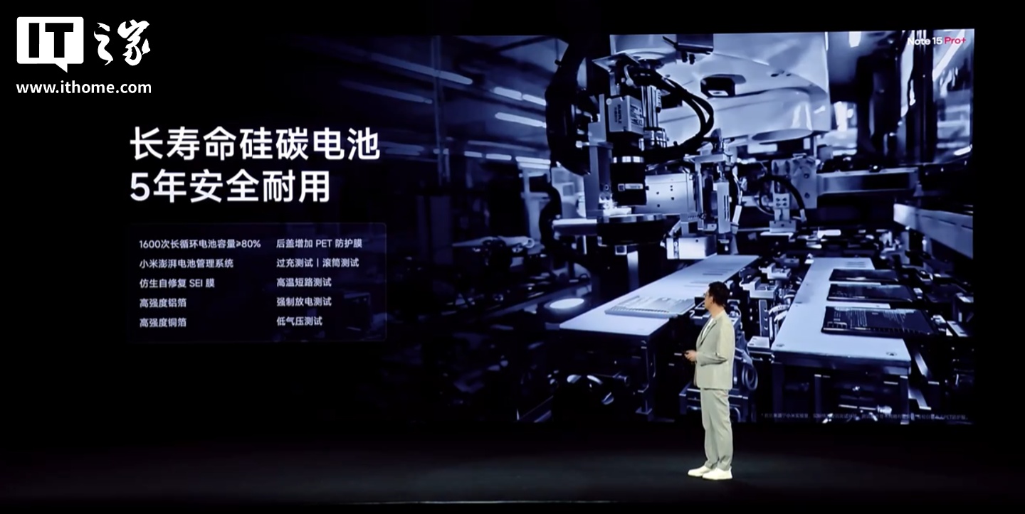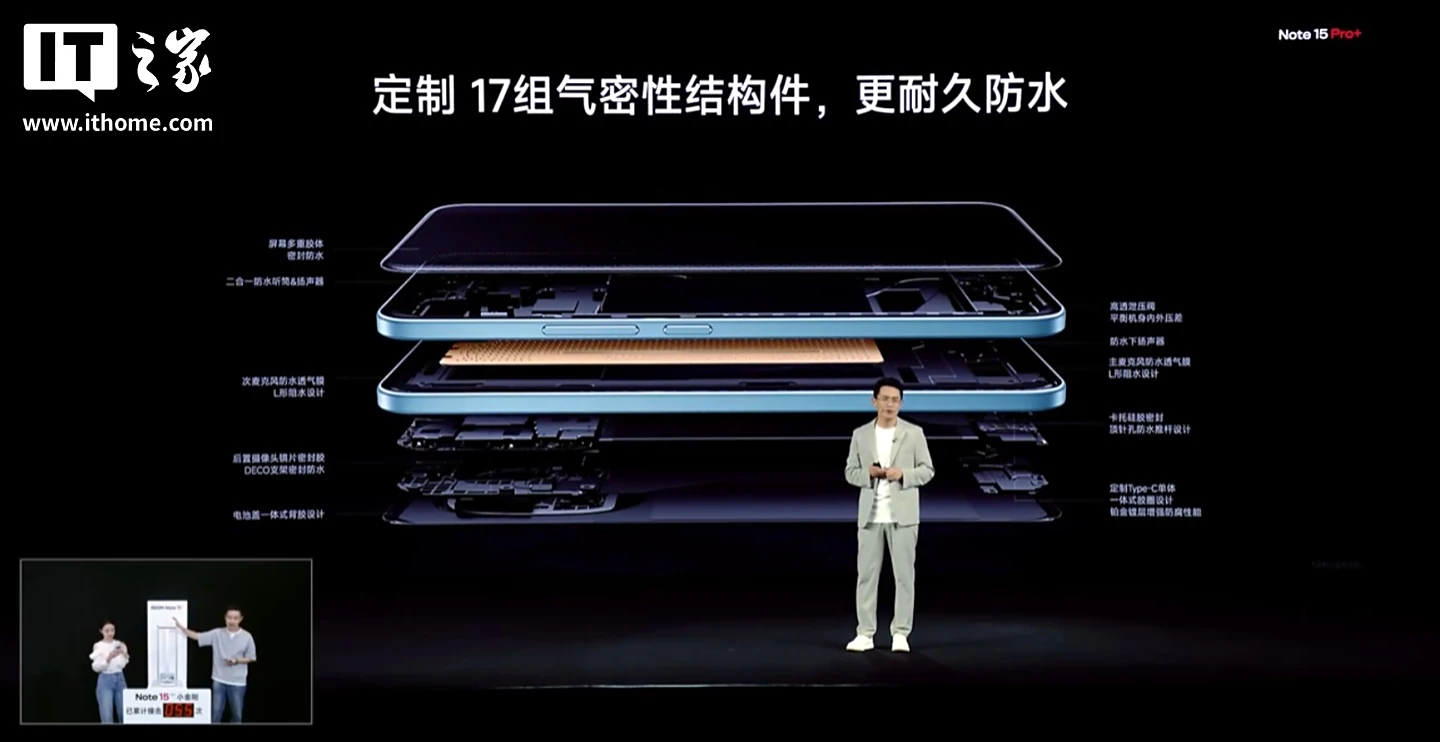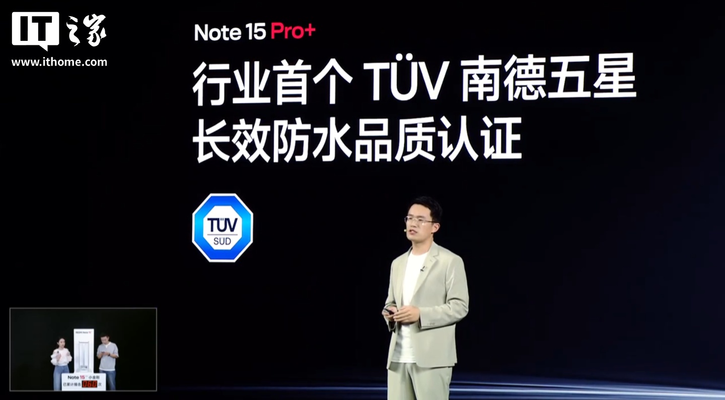 小米 REDMI Note 15 Pro+ 手机“Note 首次”搭载小米龙晶玻璃 + 超韧玻纤背板,提升保护能力,通过了 2 米 50 次的高硬度花岗岩极限面跌,拥有金标五星双认证。