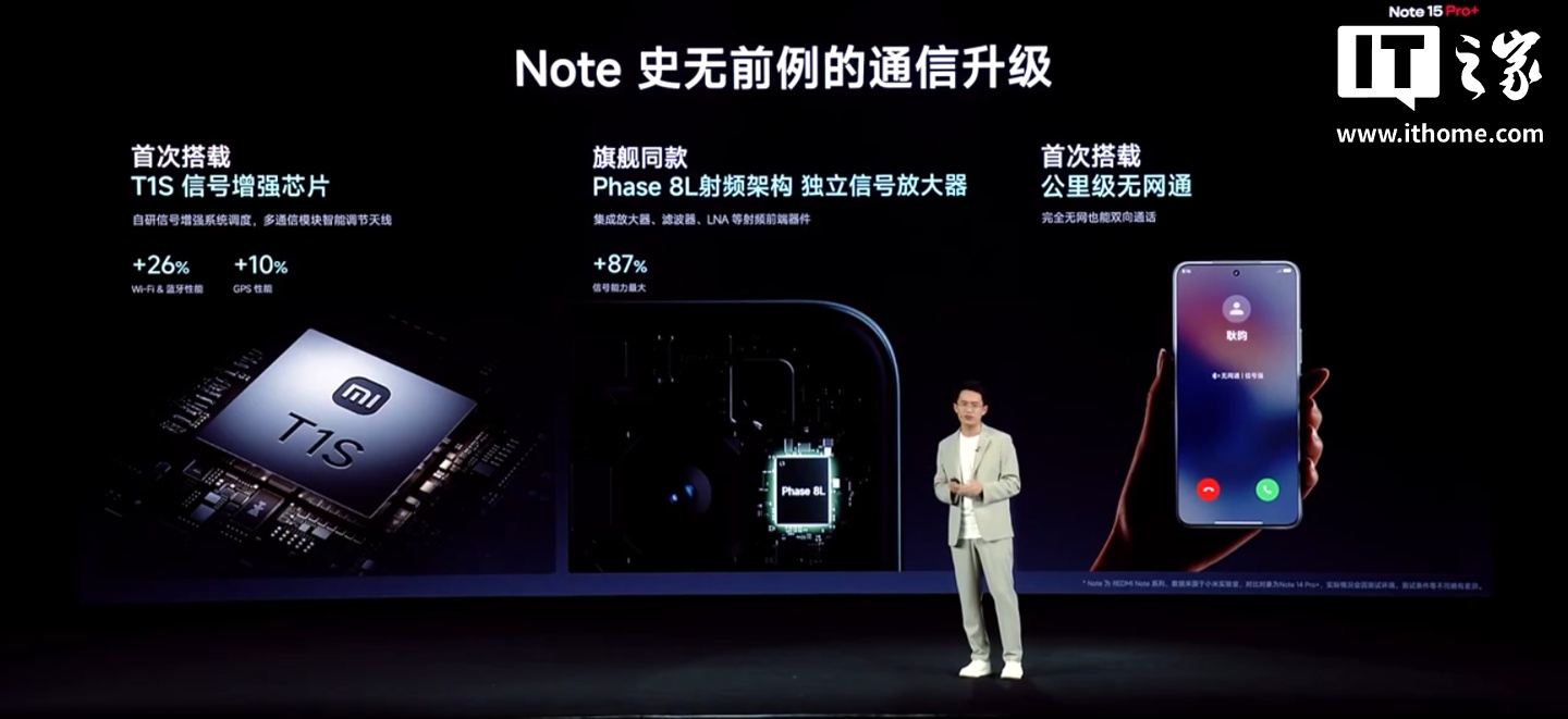 小米 REDMI Note 15 Pro+ 手机首次搭载 T1S 信号增强芯片(WiFi & 蓝牙性能增强 26%、GPS 性能增强 10%)、旗舰同款 Phase 8L 射频架构独立信号放大器(信号能力最大增强 87%),首次搭载公里级无网通(支持完全无网也能双向通话)。