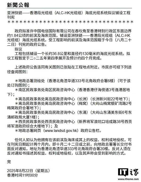 IT之家 8 月 22 日消息,香港特区政府今日发布公报,拟准许中国电信国际有限公司在舂坎角至香港特别行政区东面边界约 1.84 公顷的前滨及海床范围,铺设亚洲快链 —— 香港段光缆组(ALC-HK 光缆组)海底光缆系统。