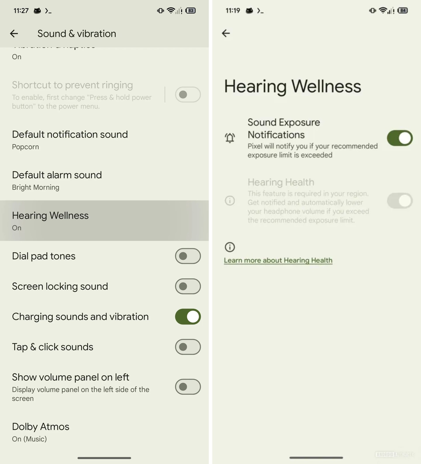新页面将位于系统“声音与振动”菜单下,包含两个开关:“声音暴露通知”(Sound Exposure Notifications)和“听力健康”(Hearing Health)。用户开启后,Pixel 会在耳机输出超过安全阈值时发出提醒。