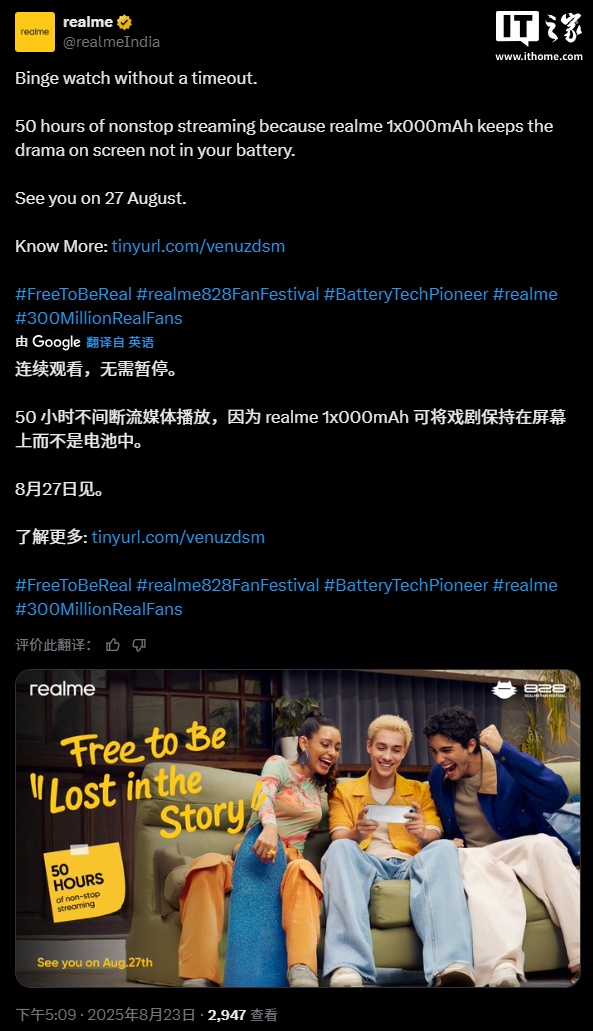 IT之家 8 月 24 日消息,真我在海外 X 平台发布了一张预热海报,宣布将在 8 月 27 日展示一款配备超大电量的新机型。