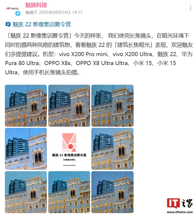 IT之家注意到,目前魅族科技每日都在发布「魅族 22 影像集训夏令营」活动拍摄的样张。官方今日分享的是「建筑长焦暗光」拍摄场景,展示了新机在暗光环境下同时拍摄两种风格的建筑物的能力。此次作陪的机型包括 vivo X200 Pro mini、vivo X200 Ultra、华为 Pura80 Ultra、OPPO Find X8s、OPPO Find X8 Ultra、小米 15、小米 15 Ultra。
