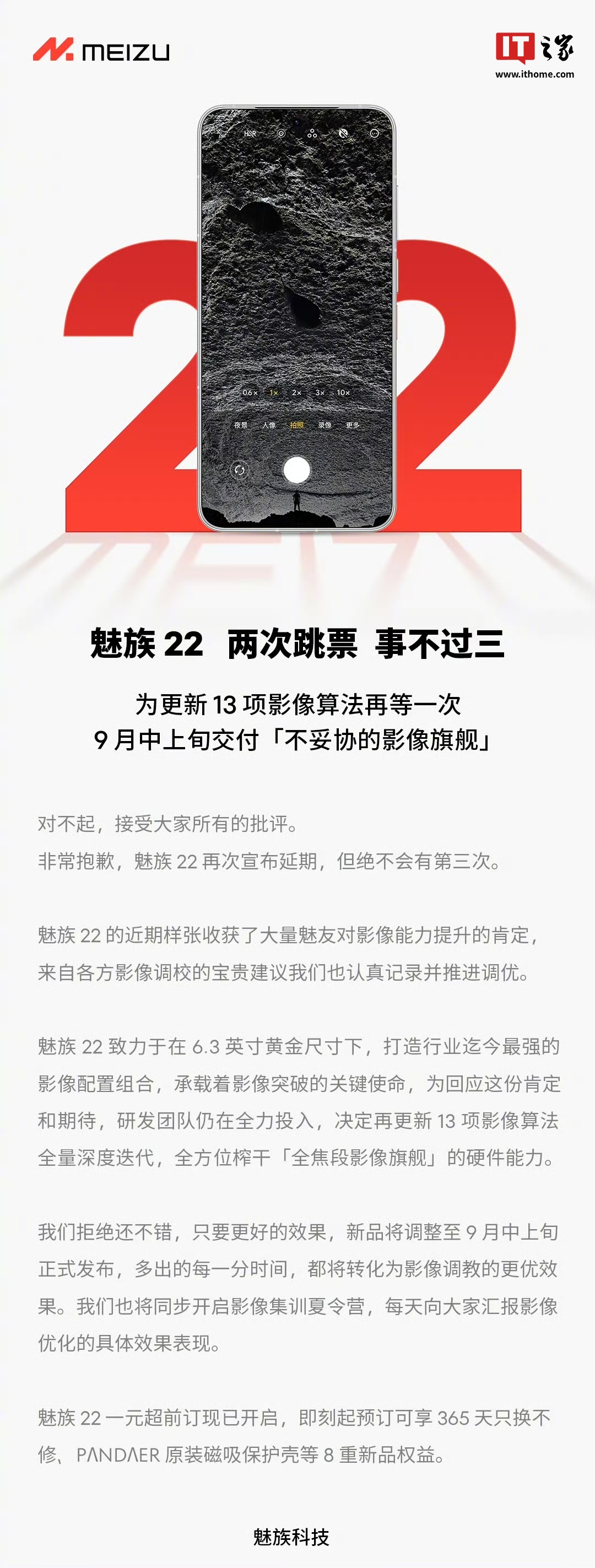 IT之家 8 月 24 日消息,魅族科技在本月 22 日官宣新机魅族 22 再度跳票,但承诺“事不过三”。官方称魅族 22 还将再更新 13 项影像算法,新机将在 9 月中上旬交付。