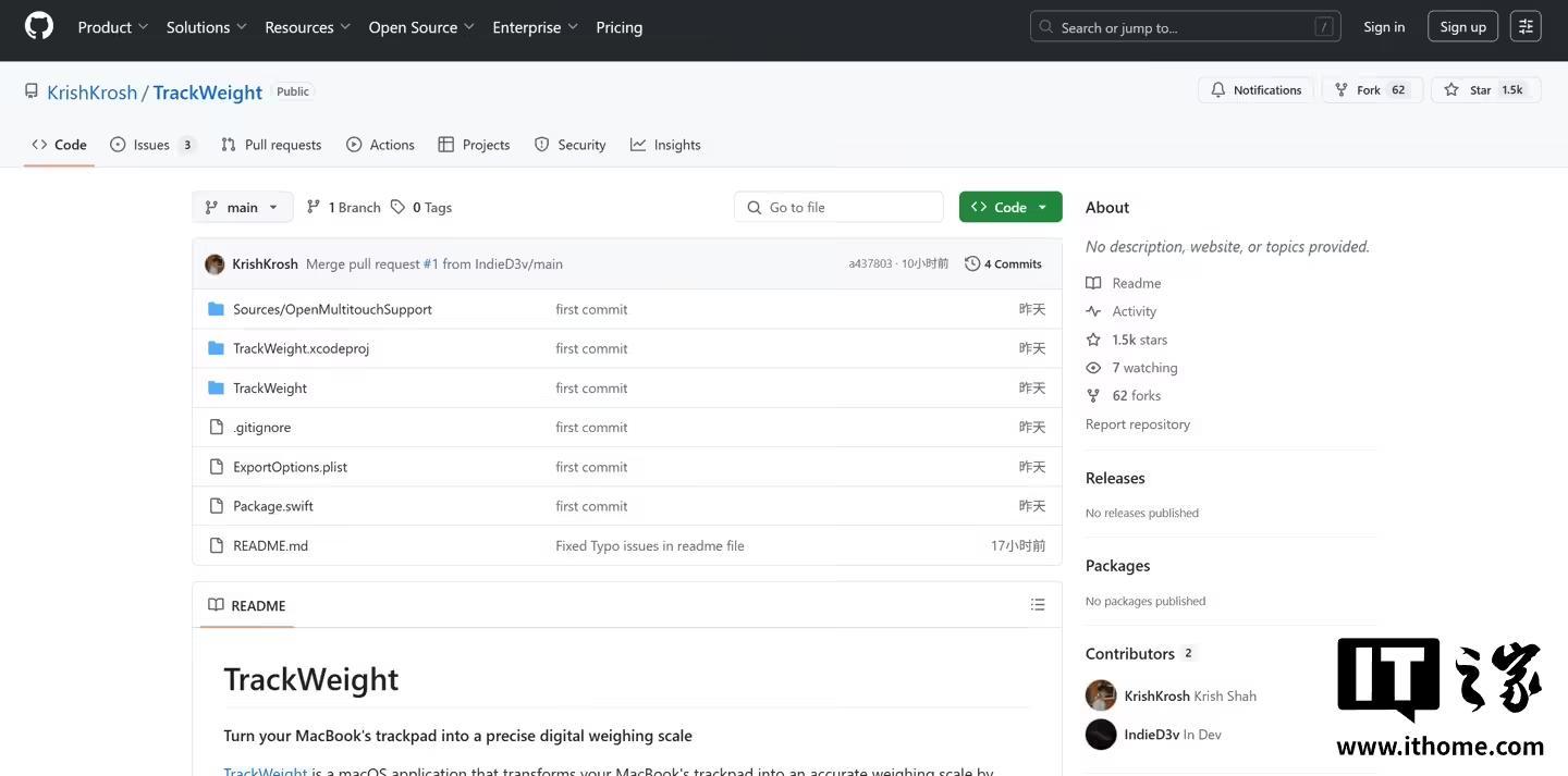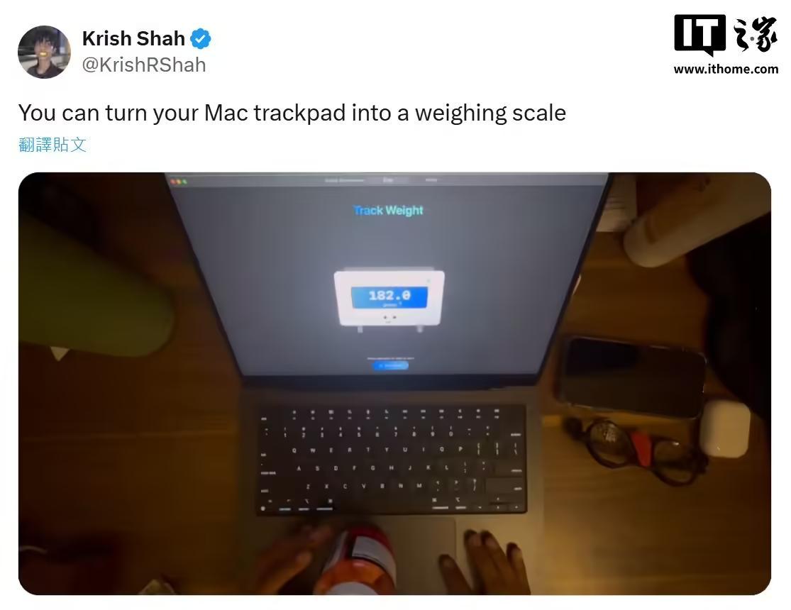 IT之家 7 月 22 日消息,开发者 Krish Shah 和 IndieD3v 昨日在 GitHub 上发布了 TrackWeight 项目,能够让苹果 MacBook 笔记本的“力度触控”技术触控板摇身一变,成为电子秤。
