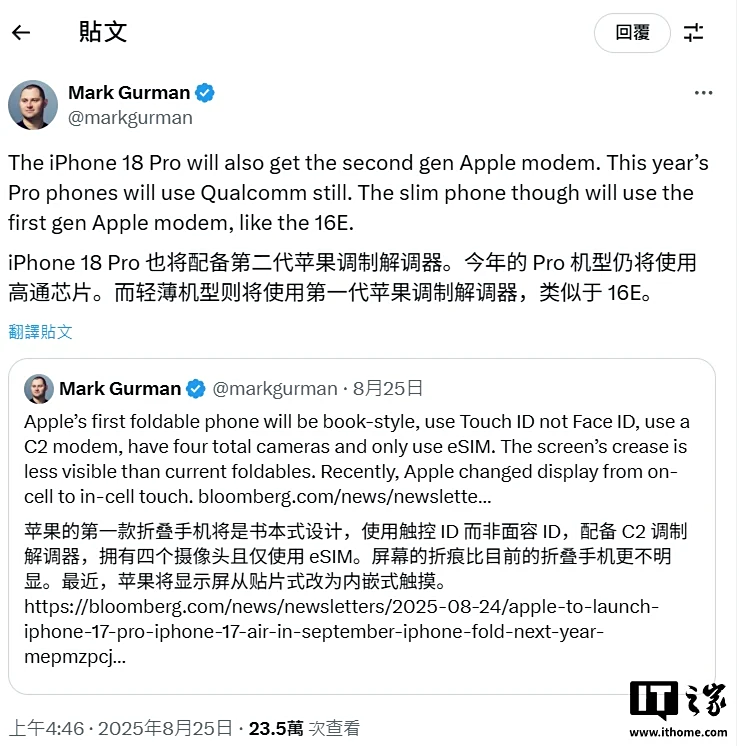 IT之家 8 月 26 日消息,彭博社记者古尔曼昨天在 X 平台透露,苹果 iPhone 18 Pro 将配备苹果自研的第二代基带。