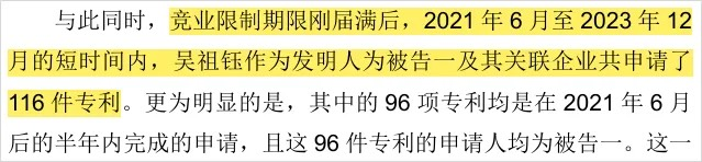 更巧合的是,吴祖钰离开宁德时代,竞业限制期满之后,从2021年6月开始,半年内申请了96项专利。