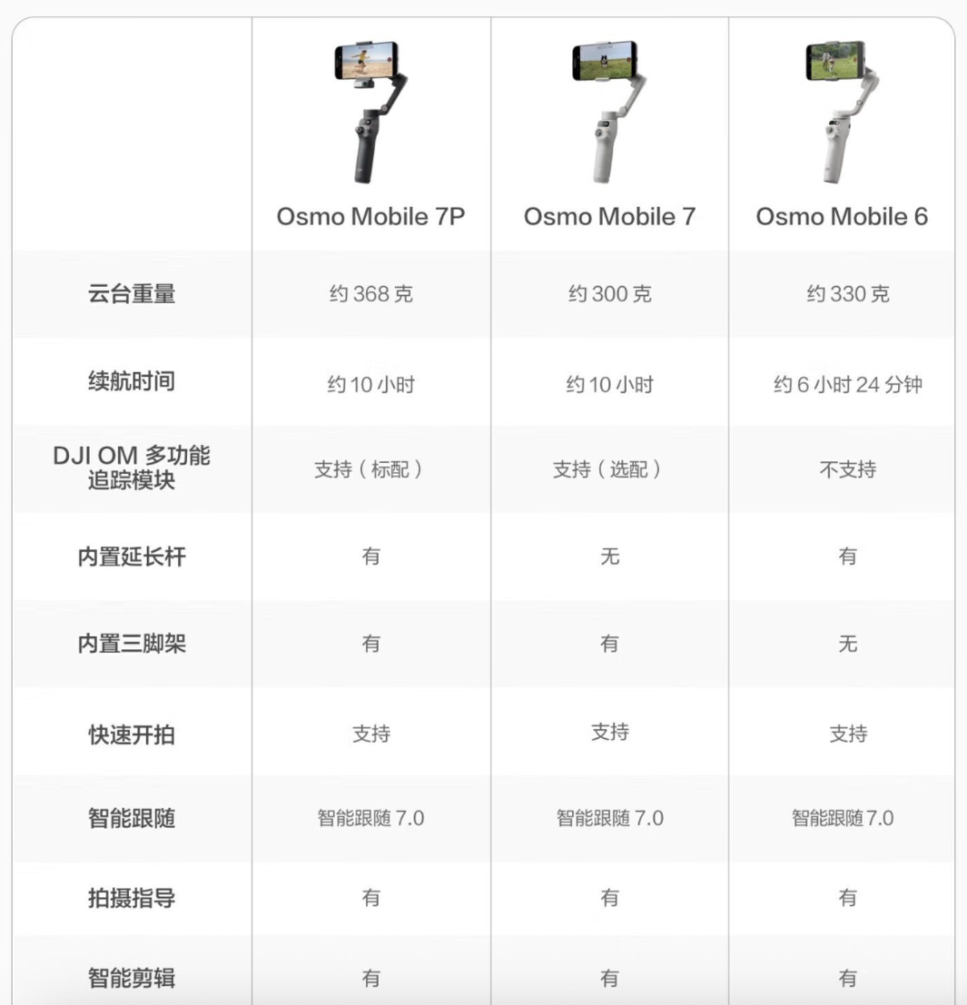 而且大疆的挤牙膏已经从无人机传染到了其他产品线,比如今年年头发布的手机稳定器 OSMO Mobile 7P,折叠形态、磁吸快拆方案与前代 OSMO Mobile 6 高度相似,肉眼可见的升级点也就把折叠扣改成了金属材质,也引来了用户们的一顿吐槽,完全没有前代 400 多的清仓价有性价比。