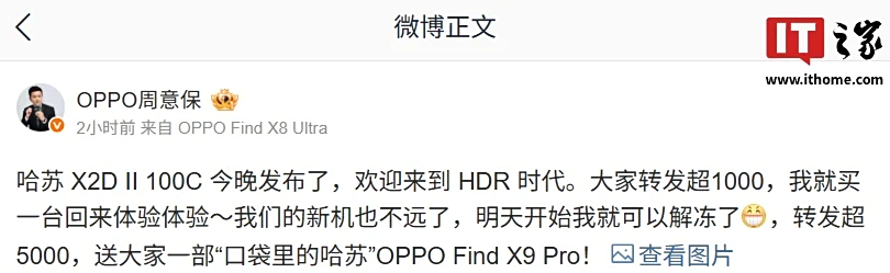 IT之家注意到,OPPO Find 系列产品负责人周意保转发了哈苏中国的微博,并欢迎哈苏“来到 HDR 时代”。周意保表示,新机也不远了,明天开始自己就可以解冻了(此处预计指 Find X9 系列新机临近发布,将开启预热)。另外他还称 OPPO Find X9 Pro 为“口袋里的哈苏”。