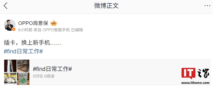 IT之家 8 月 26 日消息,OPPO Find 系列产品负责人周意保今日官宣换上了新手机,其微博小尾巴已显示为“OPPO 智能手机”。值得一提的是,他微博所带的话题为“find工作日常”,因此吸引了网友前来挖料。