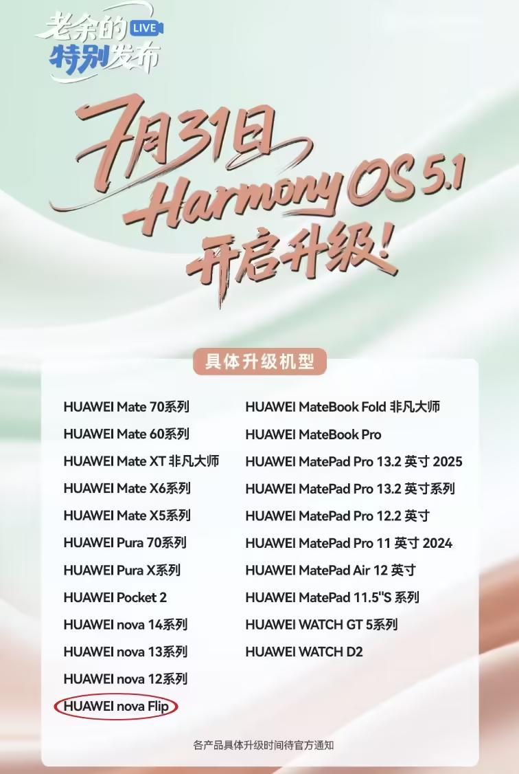 截至目前,该机并未开启预告的系统版本升级,官网支持机型名单也未出现 nova Flip。但IT之家注意到,华为常务董事、终端 BG 董事长余承东今日的 Pura80 数字版预热视频提到了鸿蒙 HarmonyOS 5.1 升级计划,其中 nova Flip 小折叠手机将一步到位,在 7 月 31 日开启新版本升级。
