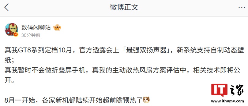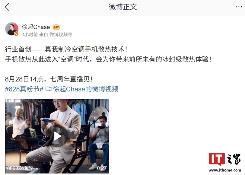 真我 realme 副总裁、全球营销总裁、中国区总裁徐起今日在微博宣布,realme 真我行业首创的制冷空调手机散热技术将在 8 月 28 日 14 点的七周年直播亮相。据其介绍,手机散热将从此进入“空调”时代,会为用户带来“前所未有的冰封级散热体验”。