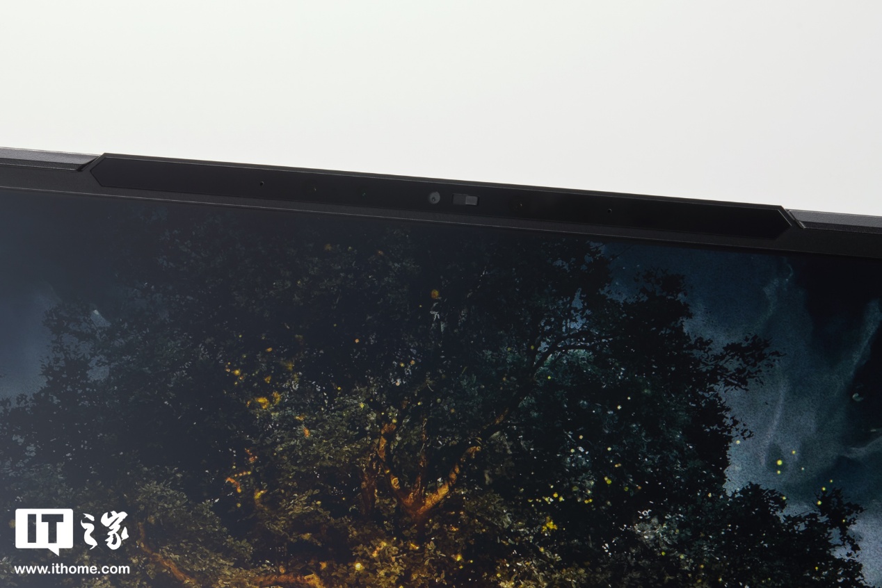 屏幕顶部边框有一条凸起设计,将 IR 摄像头(支持 Windows Hello 面容解锁)、物理防窥遮罩、传感器和麦克风阵列等一并收纳其中。