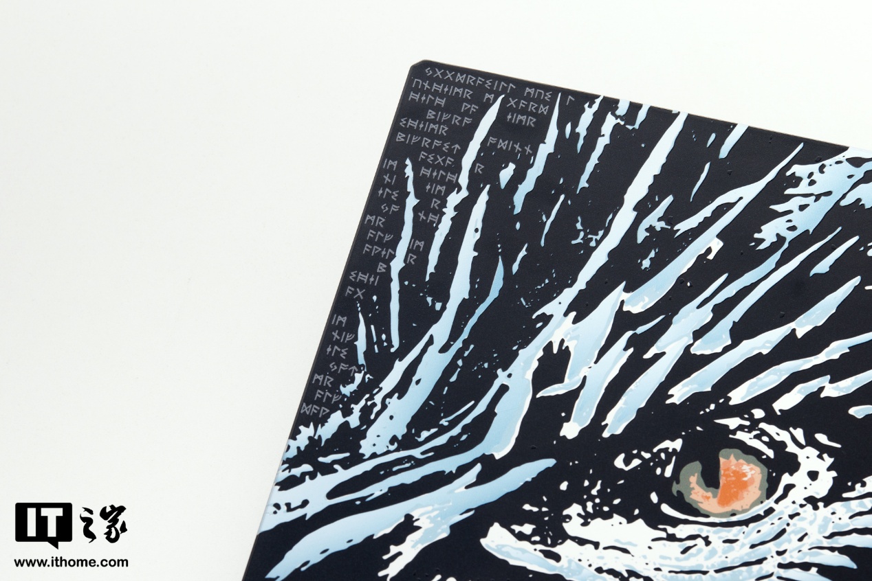 超长鼠标垫上同样印着世界树主题图案,正面手感光滑细腻,适合喜欢高 DPI 的用户。