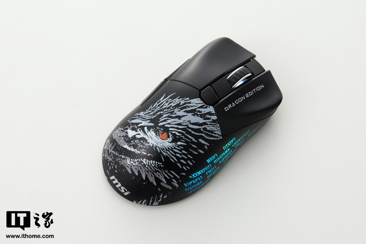 附送的鼠标型号为 M18,重量约 81g(不含 2.4G 接收器),是一款右手人体工学的中打手无线游戏鼠标。纯黑涂装处理,鼠标背部印有机身同款龙头图案,正面滚轮自带白色光效,滚轮下方还有一颗 DPI 切换按键。