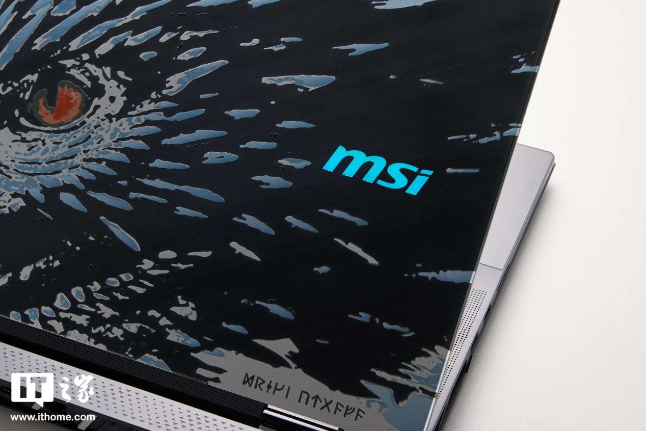 看回电脑,机身正面印有手绘风格的龙头图案,北欧巨龙的霜蓝色龙鳞,橘红龙瞳等元素通过雕刻、浸泡、再雕刻、抛光以及多彩上色等多种工艺打磨,最终以复杂蚀刻工艺呈现出栩栩如生的画面和雕刻般的精致手感。右侧中间的 MSI Logo 支持 RGB 灯效,虽去掉了标志性的龙盾造型,但依旧十分显眼。