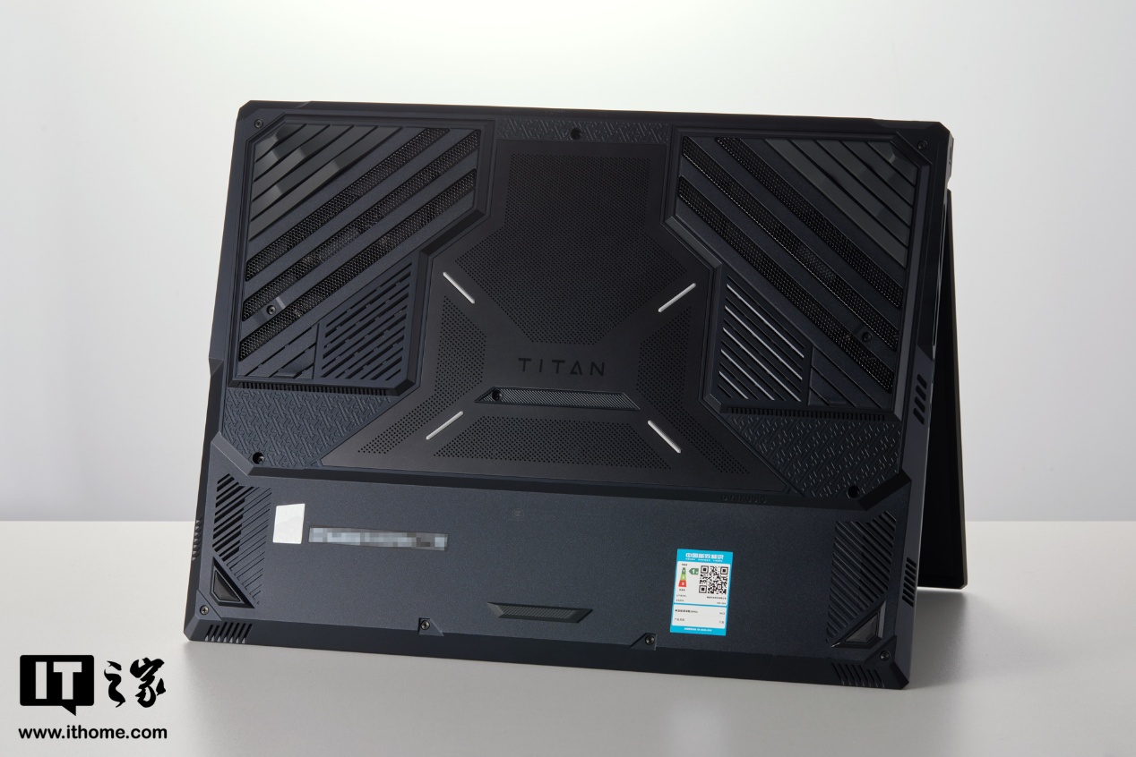D 壳设计与微星泰坦 18 Pro 一样,拥有斜切处理的脚垫和散热孔,下方两侧还有 2 个扬声器开孔。