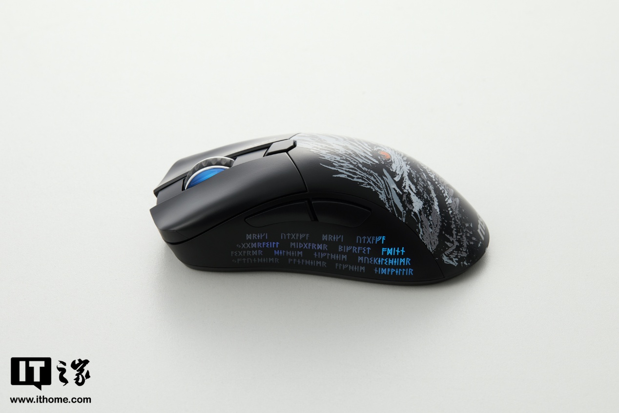 左右侧裙部分设计了透光北欧卢恩符文,支持 RGB 灯效,左侧裙部分提供 2 个自定义多功能按键。底部拥有 2.4G、有线和蓝牙模式切换开关,灯光切换按钮以及蓝牙配对键,自带 2.4G 接收器收纳槽。