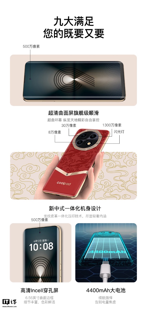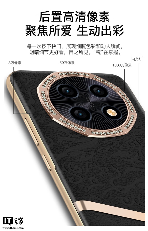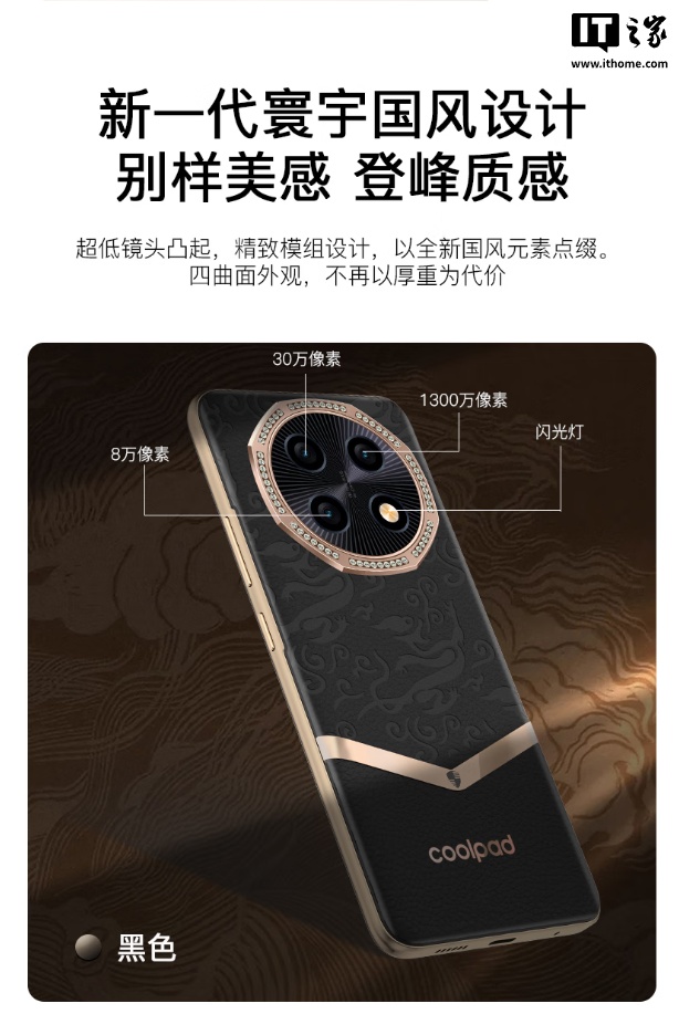 根据官方介绍,这款手机有红色、黑色两种配色,在外观方面采用“新中式一体化机身设计”,其后盖使用“龙纹皮革一体化压印技术”,摄像头模组上点缀有“国风元素”,后摄分别为 1300 万像素 + 30 万像素 + 8 万像素。