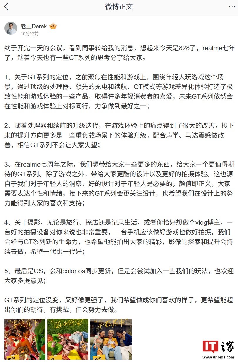realme 真我副总裁王伟今日发文分享了一些 GT 系列的思考,GT 系列新机未来将不仅聚焦性能和游戏,还将提升设计和拍摄体验,同时 realme UI 将和 OPPO ColorOS 同步更新,但会加入专属玩法。IT之家附王伟微博原文如下: