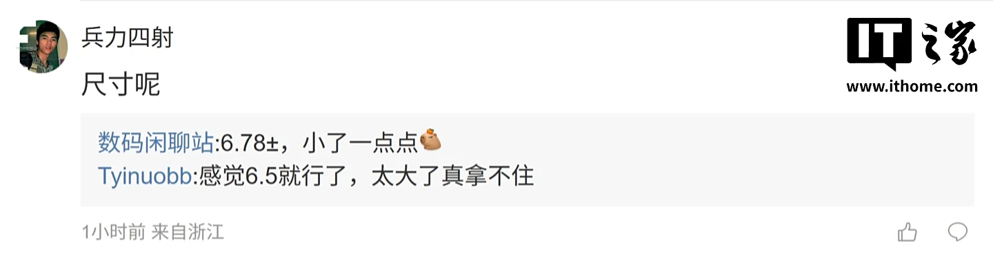 后续有用户在评论区询问:“24+1TB 怎么没有”,博主回复道:“目前没有收到 24GB 版本的备案信息”;另一名用户则询问道:“尺寸呢”,博主则表示:“6.78±,小了一点点”。