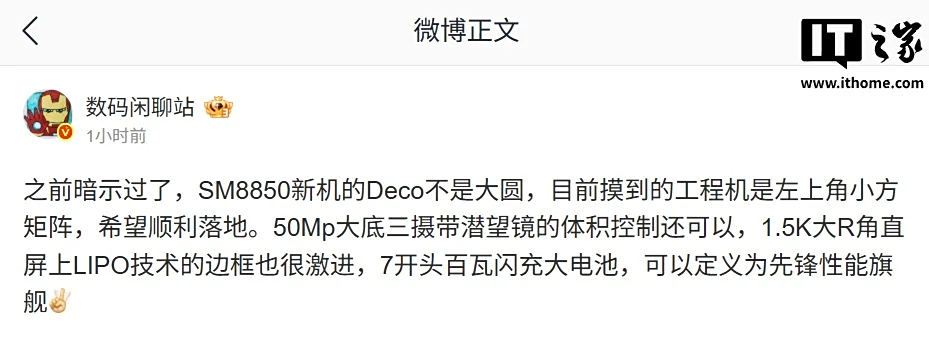 值得注意的是,这名博主曾在本月初爆料,某厂的 SM8850 芯片新机后摄模组不是大圆,目前摸到的工程机是左上角小方矩阵,配备 5000 万像素三摄,带有潜望镜,配以 1.5K LIPO 技术大 R 角直屏,边框尺寸“很激进”。