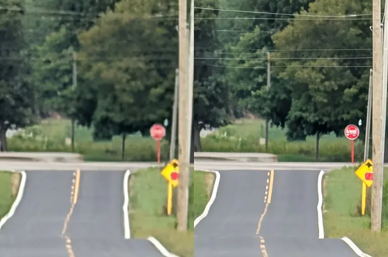 Scalzi 实测表示在水果或砖墙等简单场景中,AI 能填充出逼真的纹理;但在街牌文字等复杂细节下,生成图像出现失真,无法解析清晰字形。他认为这种技术并非放大镜般的真实还原,更像是艺术加工。