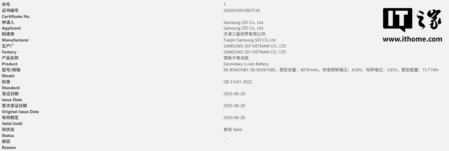 IT之家 8 月 30 日消息,天津三星视界有限公司有一款锂离子电池于 8 月 29 日通过了国家 CCC 质量认证,包括 EB-BS947ABY 和 EB-BS947ABE 两个型号,@A数码客 等博主称其属于明年 Galaxy S26 Edge 所配电池。