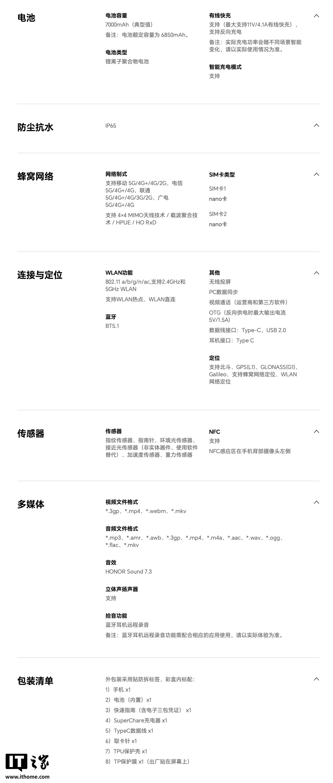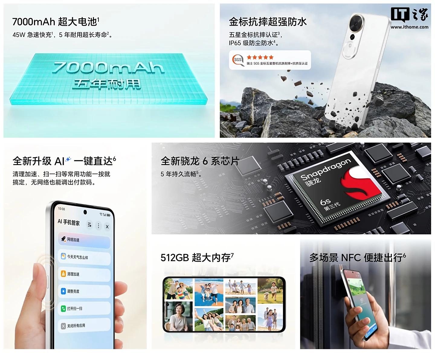 该机内置 7000 毫安时电池,支持 45W 有线充电、反向充电。手机通过 IP65 和金标五星认证,具备 360° 抗摔特性(抗摔高度达 2 米),并通过 24 小时淋雨测试,支持满级防尘、湿手触控功能,同时配备 AI 一键直达、400% 立体声双扬、NFC 等配置。