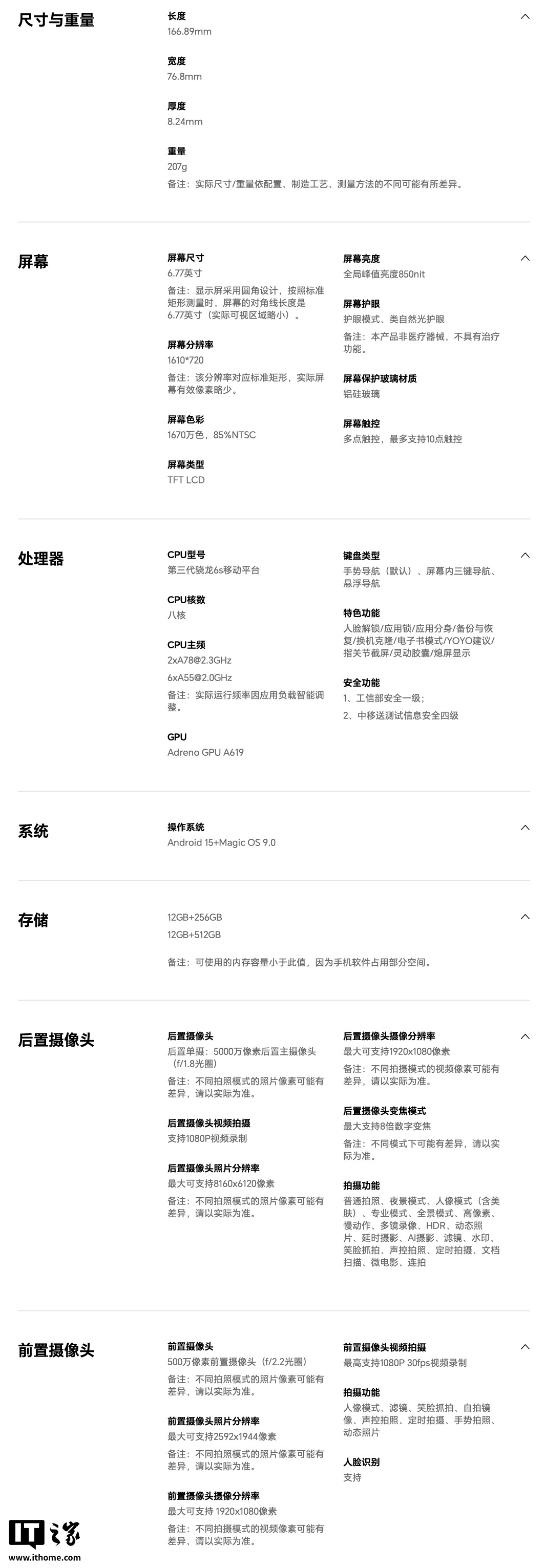 该机厚度 8.24mm,重量 207g,提供玉龙雪、幻夜黑两款配色,手机正面配备一块 6.77 英寸 1610×720 分辨率 120Hz TFT LCD 打孔面板(亮度 850 尼特),提供 5MP 自拍摄像头;手机背面提供 50MP 单摄。