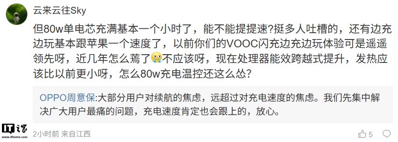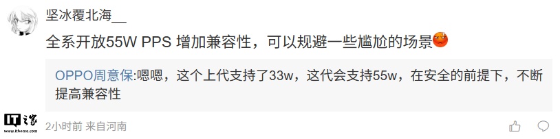 周意保还在评论区回复了部分网友的问题:针对充电能不能提速,他表示“大部分用户对续航的焦虑,远超过对充电速度的焦虑。我们先集中解决广大用户最痛的问题,充电速度肯定也会跟上的,放心”;针对能否全系开放 55W PPS 快充,他回复“嗯嗯,这个上代支持了 33W,这代会支持 55W,在安全的前提下,不断提高兼容性”。