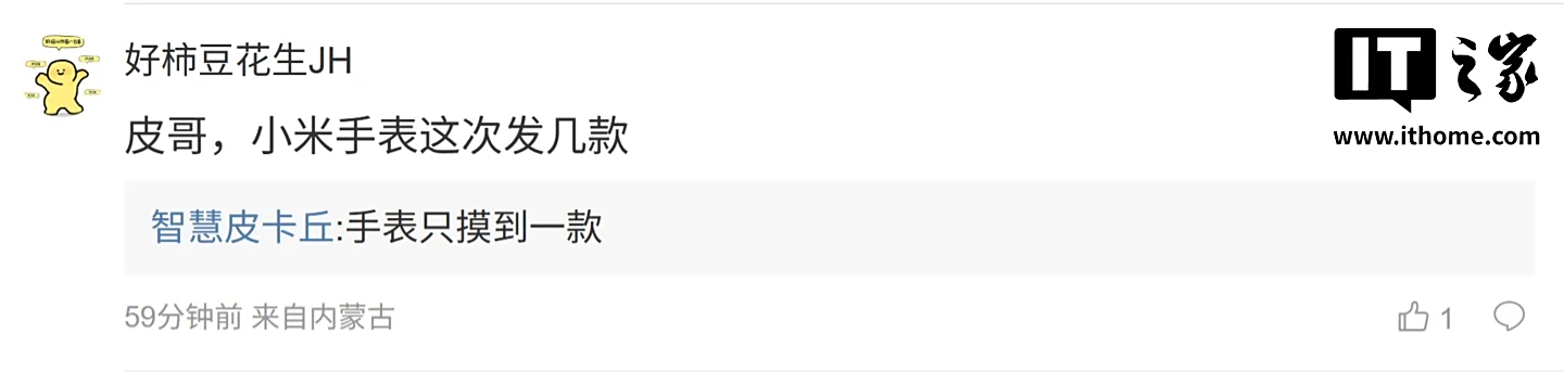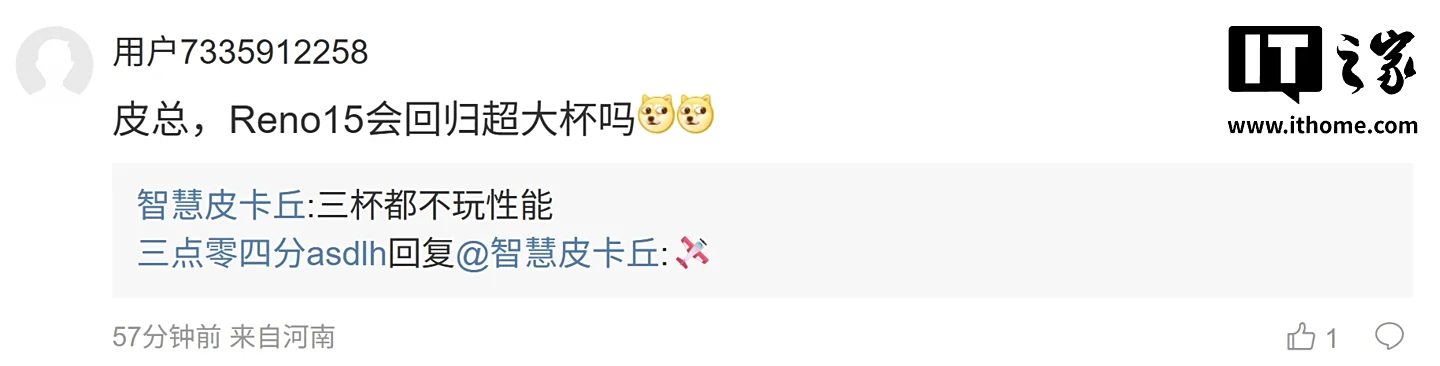 后续有用户在评论区询问:“皮哥,小米手表这次发几款”,博主回复道:“手表只摸到一款”;另一位用户则询问道:“皮总,Reno15 会回归超大杯吗
