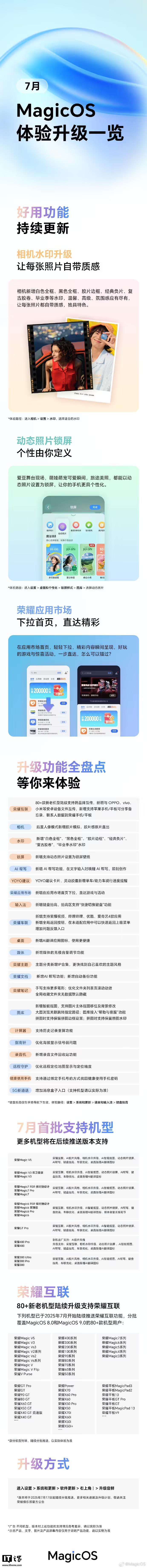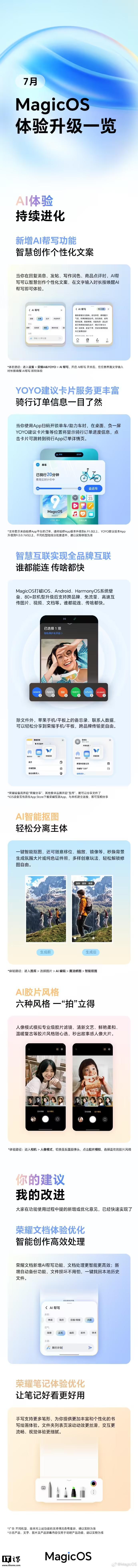 IT之家 7 月 25 日消息,荣耀 MagicOS 今天发文,带来 MagicOS 七月体验升级一览,更新 AI 帮写、YOYO 建议卡片、智慧互联等功能。