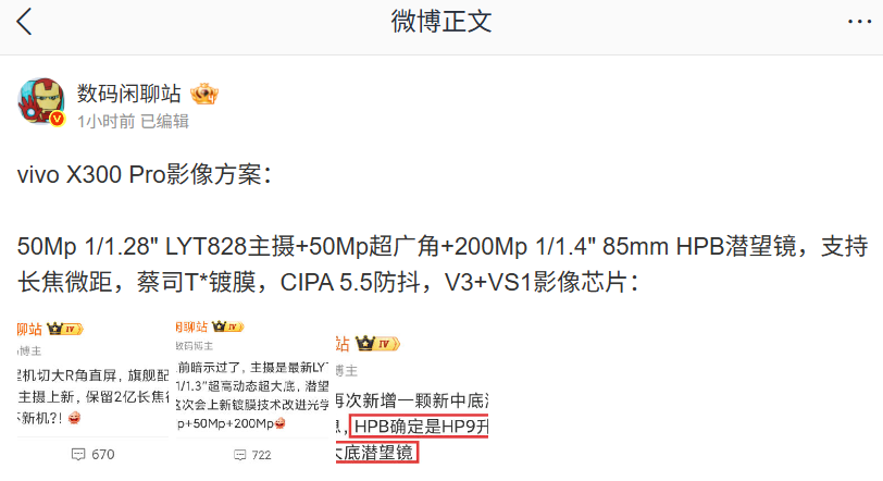 据博主 @数码闲聊站 今日爆料,vivo X300 Pro 手机将配备 50Mp 1/1.28″ LYT828 主摄 + 50Mp 超广角 + 200Mp 1/1.4″ 85mm HPB 潜望镜,拥有蔡司 T* 镀膜、搭载 V3+VS1 影像芯片,支持长焦微距、CIPA 5.5 防抖等。