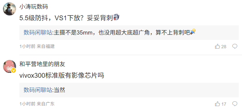博主还在评论区补充了一些细节:针对 5.5 级防抖和 VS1 芯片下放是否属于背刺 Ultra 老机主,他表示“主摄不是 35mm,也没用超大底超广角,算不上背刺吧”;针对 vivo X300 标准版是否配备影像芯片,他回复称“当然”。