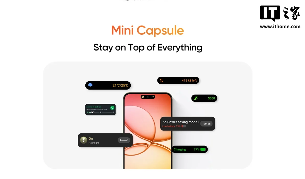 软件方面,这款手机搭载基于 Android 15 打造的 realme UI 6.0 系统,支持“迷你药丸”特性,类似苹果 iPhone 的“灵动岛”,可在手机摄像头附近显示天气、电话、步数、打车状态等信息。
