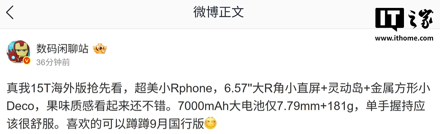 IT之家 9 月 2 日消息,realme 真我今天在海外市场预热了旗下 15T 手机,主打“果味”质感和 7000mAh 大电池本月有望推出国行版