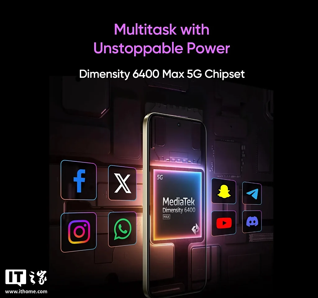 硬件方面,这款手机采用 7.79mm 超薄设计,配以 6.57” 大 R 角直屏,重量为 181 克并拥有 7000mAh“泰坦电池”,可听 128 小时音乐、玩 13 小时游戏,配有联发科天玑 6400 芯片,可流畅运行各种社交媒体应用。