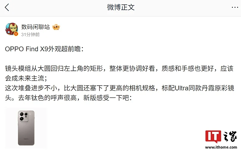 IT之家 9 月 2 日消息,博主 @数码闲聊站 今日分享了 OPPO Find X9 手机的外观,新机的镜头模组从大圆回归左上角的矩形设计。博主称“整体更协调好看,质感和手感也更好,应该会成未来主流”。