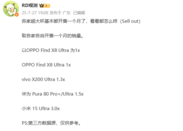 从数据来看,该博主将OPPO Find X8 Ultra的销量设定为基准值1×。vivo X200 Ultra的表现略胜一筹,达到1.3×。华为Pura 80 Pro+/Ultra凭借品牌影响力和技术创新,销量达到1.5×,显示出较强的市场号召力。然而,最引人注目的是小米15 Ultra,其销量高达3.0×,远超其他竞争对手。这一成绩可能与小米在性价比、硬件配置以及营销策略上的优势密切相关。