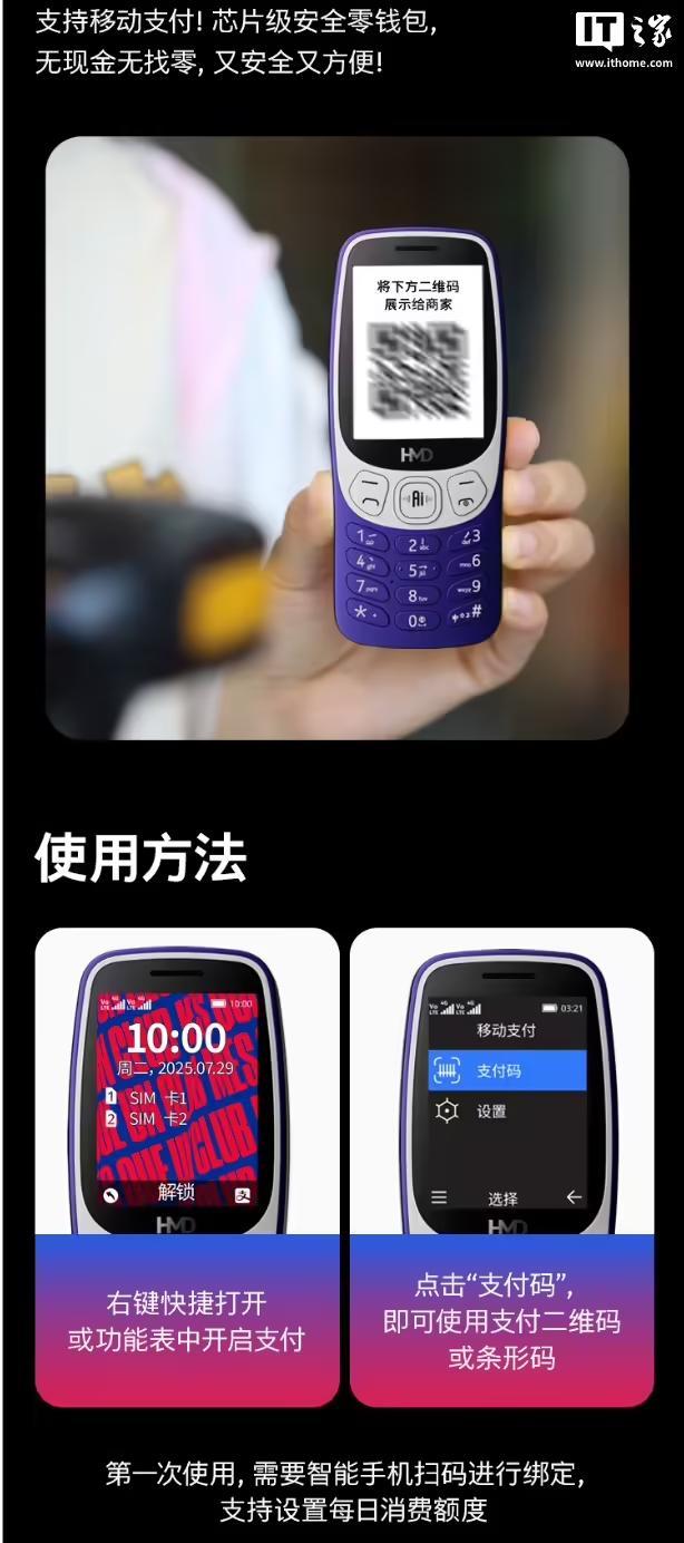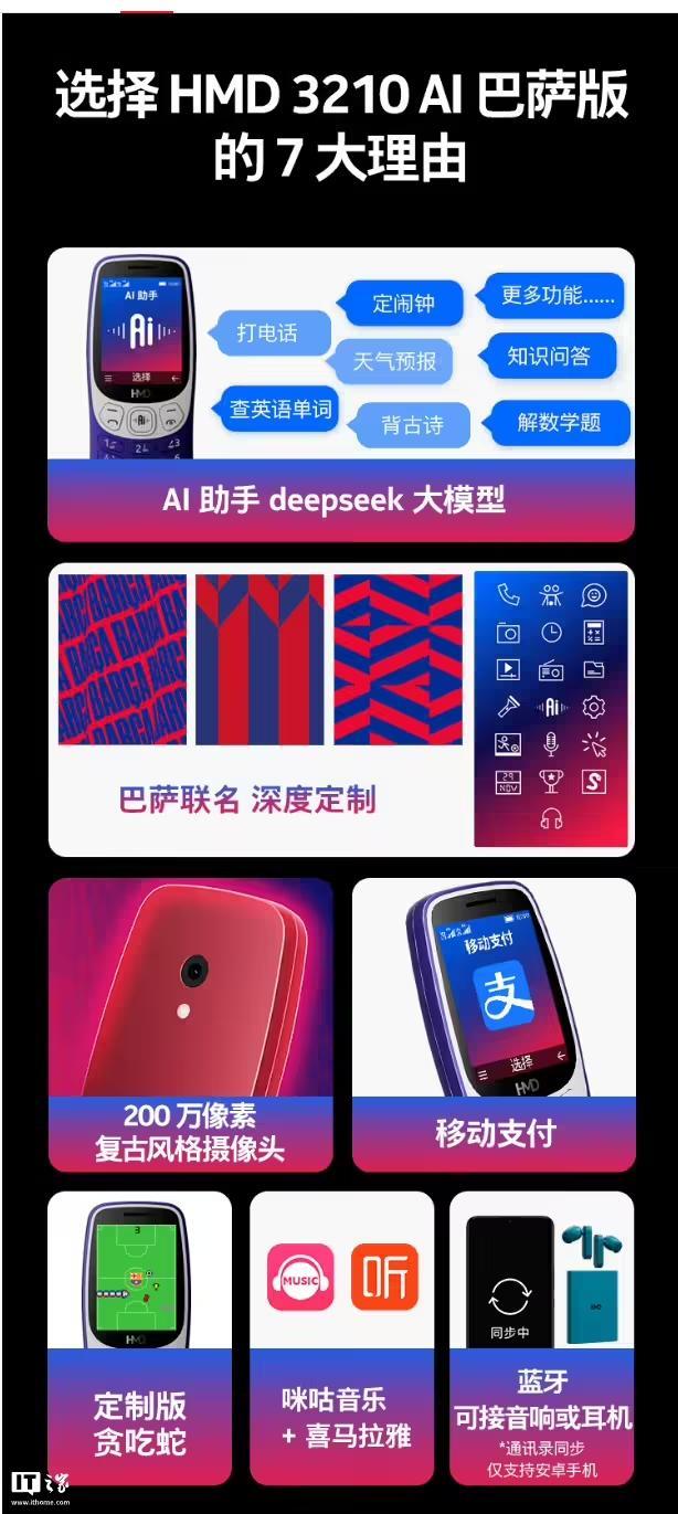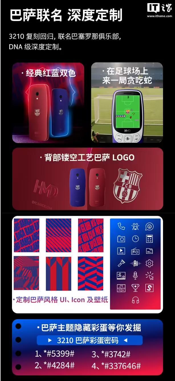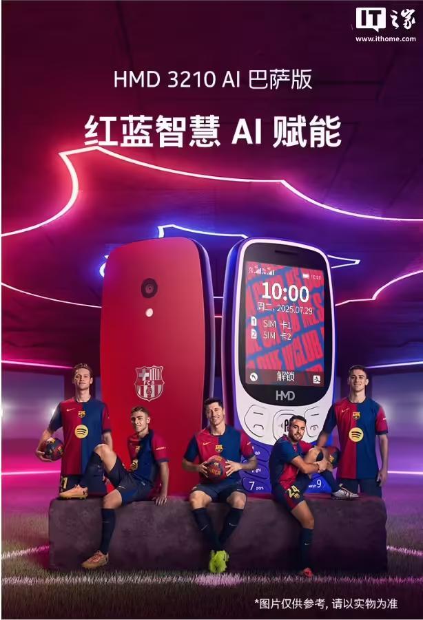 IT之家 7 月 29 日消息,HMD 今天上架了巴塞罗那足球队联名版 3210 功能手机,深度定制外壳、壁纸、系统界面等,支持支付宝被扫支付、Deepseek AI 助手,预售到手价 429 元。