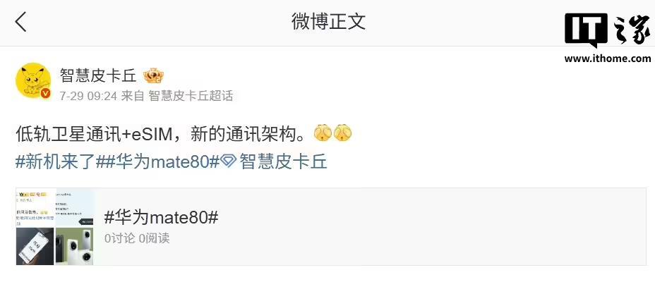 IT之家 7 月 30 日消息,博主 @智慧皮卡丘 昨天在微博透露,华为新机将采用全新通讯架构,结合后续评论内容预计为 Mate 80 系列。
