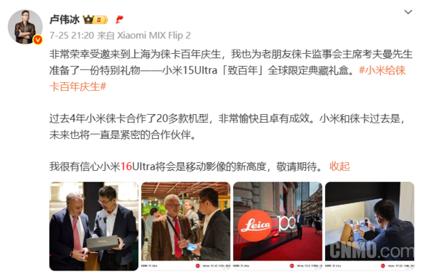 值得一提的是,小米集团合伙人、总裁、小米品牌总经理卢伟冰此前表示小米16 Ultra将是“移动影像的新高度”,并且会和徕卡进行更加紧密深度的合作。