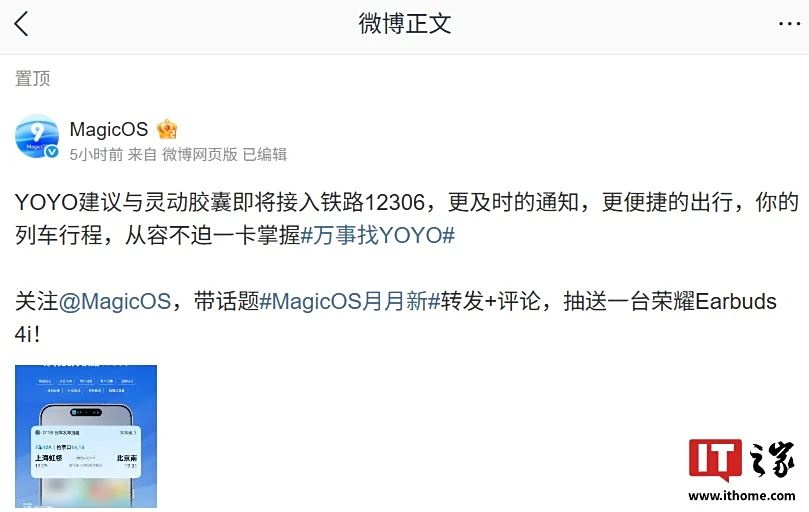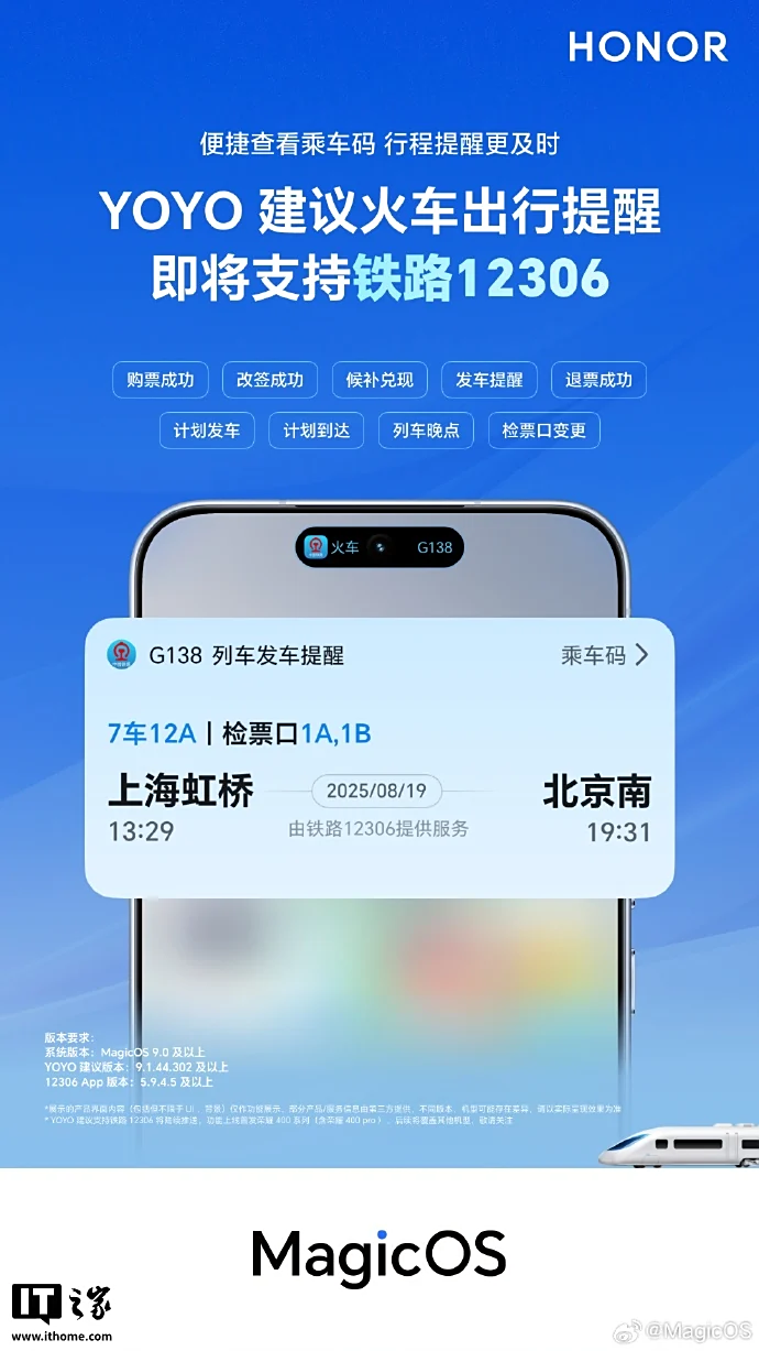 IT之家 9 月 2 日消息,荣耀 AI OS 官方微博 @MagicOS 今日宣布,YOYO 建议与灵动胶囊即将接入铁路 12306,可提供更及时的通知和更便捷的出行。