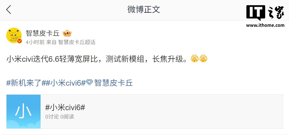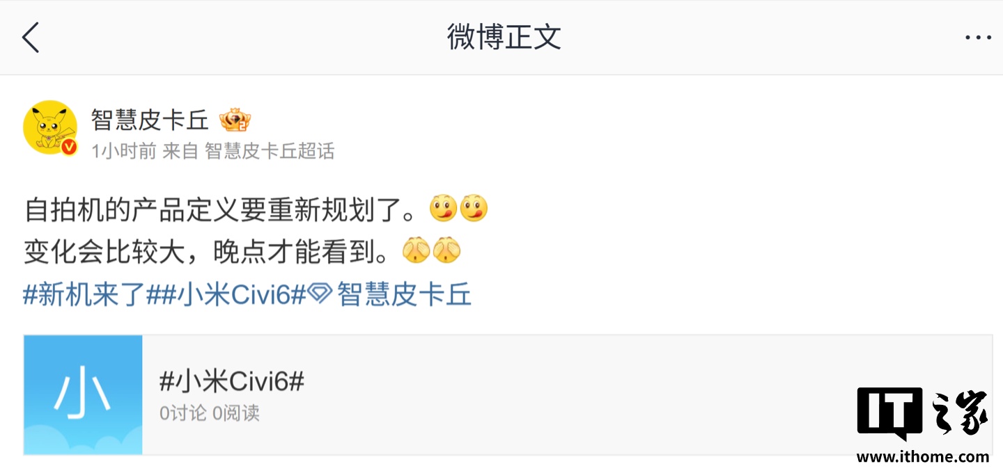 博主表示,这台手机的变化“会比较大,晚点才能看到”,结合博主文中 Tag 暗示和评论区猜测,预计这款手机是小米 Civi 6。