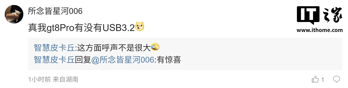 ”;另一名用户则询问道:“真我 GT8 Pro 有没有 USB 3.2”,博主则回复道:“这方面呼声不是很大