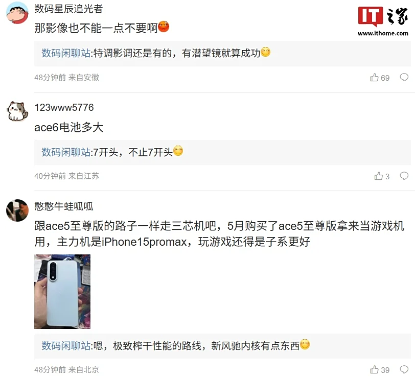 IT之家注意到,博主还在评论区中回复了部分网友的问题:针对一加 15 新机的影像能力如何,他表示“特调影调还是有的,有潜望镜就算成功”;针对一加 15 有点去年 iQOO13 老路的感觉,博主称“不是坏事,iQOO13 是去年子系骁龙 8E 中卖得最好的”;针对一加 Ace 6 的电池大小如何,他回复“7 开头,不止 7 开头”。